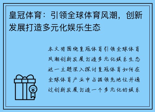 本文将围绕“皇冠体育:引领全球体育风潮,创新发展打造多元化娱乐生态”这一主题,深入探讨皇冠体育如何在全球体育产业中占据领先地位,并通过创新发展,打造一个多元化的娱乐生态。文章将从四个方面详细阐述皇冠体育的优势与发展策略:首先,皇冠体育如何通过技术创新推动体育行业的数字化转型;其次,皇冠体育如何在全球化竞争中树立品牌影响力;第三,皇冠体育如何通过多元化的产品与服务构建多元化娱乐生态;最后,皇冠体育如何通过社会责任与可持续发展增强品牌的社会影响力。通过这些方面的分析,本文旨在呈现皇冠体育作为行业领军者的全貌,并展望其未来的发展前景。